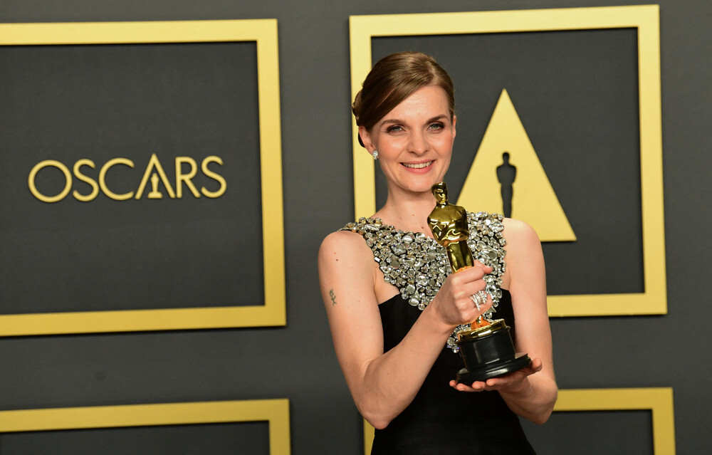 Hildur Guðnadóttir poseert met haar Oscar, die ze won met haar score voor de film Joker.