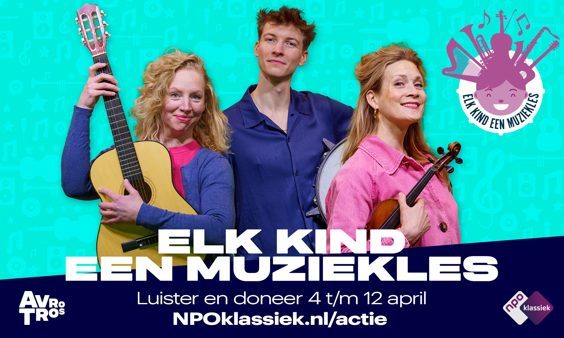 Presentatoren Jet Berkhout, Carine Lacor en Johannes Wirix-Speetjens van het programma De Muziekfabriek komen van 4 t/m 12 april in actie met ‘Elk kind een muziekles’ om geld op te halen voor het Jeugdfonds Sport & Cultuur. De actie heeft inmiddels al vele donaties opgeleverd, en donateurs reageren enthousiast om hun steun uit te spreken!