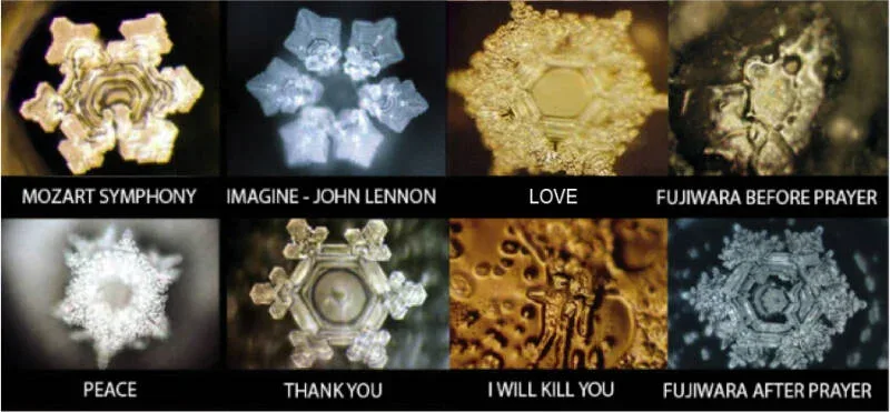 Hij bevroor druppels water en maakte foto’s van de ijskristallen. Wanneer hij klassieke muziek liet horen tijdens dit proces werden prachtige waterkristallen gevormd. Bij luide en agressieve rockmuziek was er een vervorming van de oorspronkelijke kristalstructuur te zien.