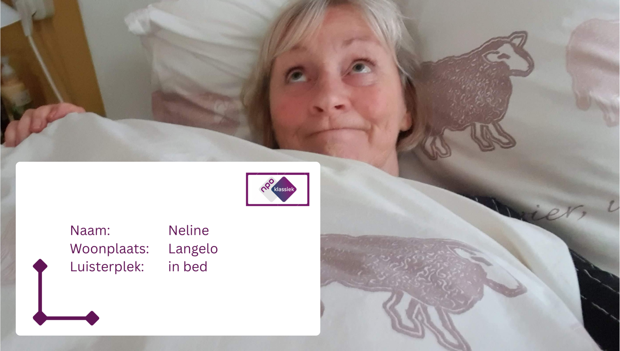 Neline verzorgt al acht jaar schapen. Helaas helpt het schaapjes tellen haar niet altijd om in slaap te komen, zeker niet als de schapen om half zes ‘s ochtends al willen eten. Gelukkig helpt de podcast Kalm met Klassiek de zelfbenoemde ‘slechtste slaper van het noordelijk halfrond’ om een beetje tot rust te komen. Vooral Abs warme stemgeluid heeft een ontspannende werking op haar: “Ik heb het ook bij Maarten van Rossem, maar die draait er geen mooie muziek bij!”