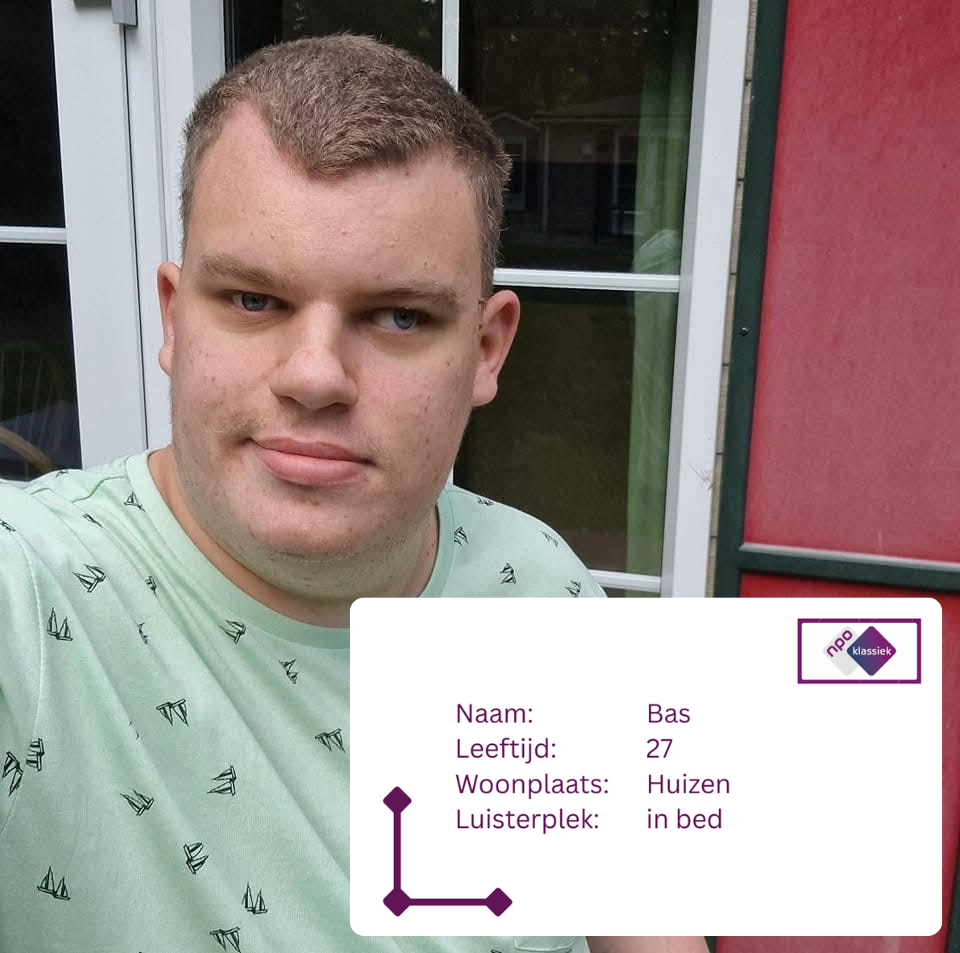 Bas is groot fan van radio en televisie. Hij luistert altijd naar de podcast Kalm met Klassiek en vindt de werken die Ab elke werkdag laat horen heel mooi. Bas luistert graag in bed naar de podcast, net voordat hij gaat slapen. Daarnaast leert hij ook veel van de podcast: “Ik ben nog niet zo heel erg bekend met klassieke muziek en ik ben nog aan het ontdekken. Vooral de rustige muziek spreekt mij erg aan. Lekker rustig worden van de muziek die Ab dagelijks voorschotelt.”