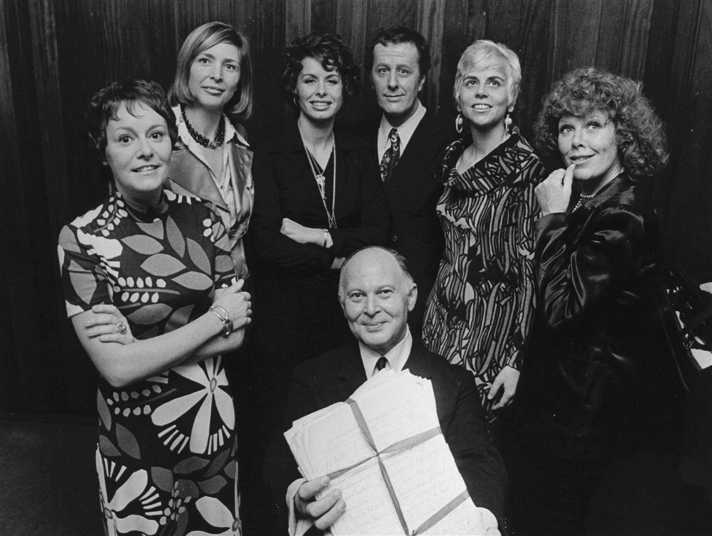 Actie voor Hilversum 4 met initiatiefnemer Theo Olof, voorzien van lijsten met handtekeningen. Achter hem staan Sacha Denisant, Ageeth Scherphuis, Alice Oppenheim, Amy Vos en Yoka Berretty, presentatrices van de benefietconcerten.