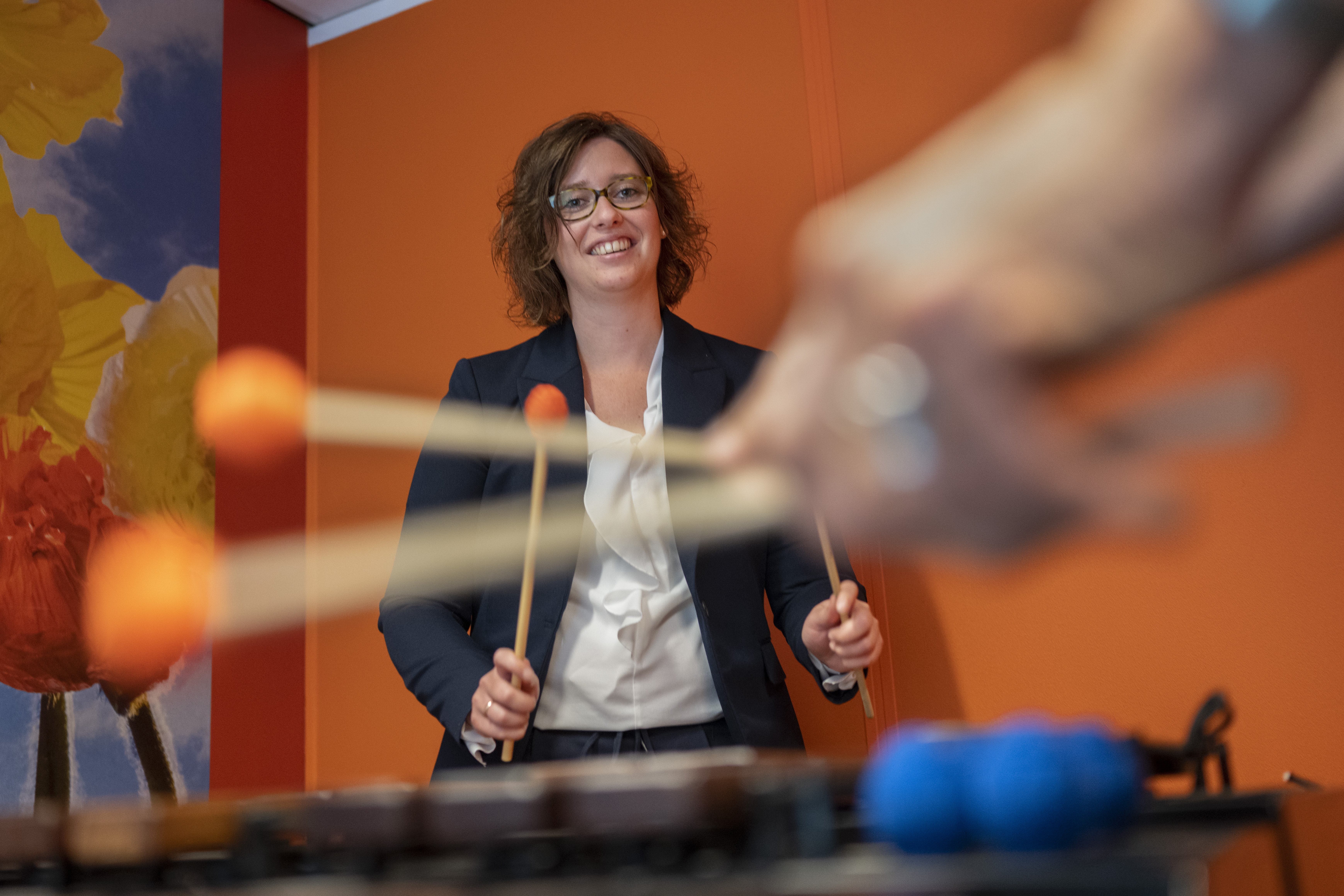 Het samenspel is ook precies de bedoeling van de muziektherapie. Eerst speelt de cliënt zelf iets op het gekozen instrument. Dat spelen kan een gevoel oproepen, soms door de onwennigheid ook angst. Vervolgens speelt de muziektherapeut mee, synchroon met de cliënt, en daardoor neemt de angst vaak af. "De cliënt krijgt door de synchronisatiemuziek het gevoel dat het oké is en het er mag zijn. Op die manier voelt de persoon ruimte om door te spelen", zegt Aalbers.