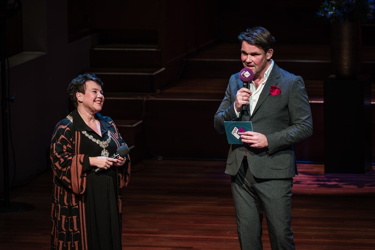 Presentator Ab Nieuwdorp en burgemeester van Utrecht Sharon Dijksma in 2024