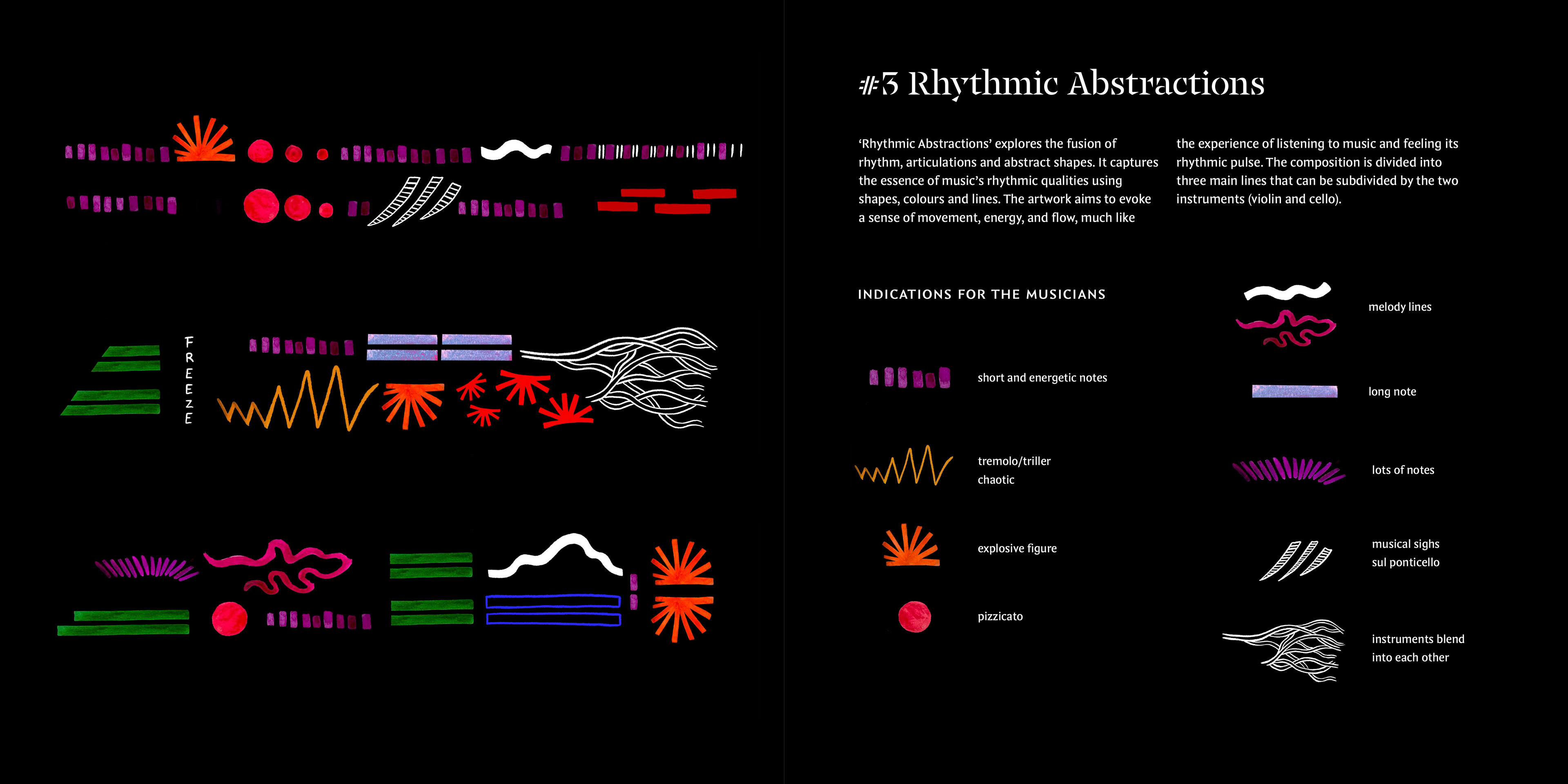 Kleurenexplosie. Violist Kaja Majoor kan niet alleen heel goed spelen, maar ook prachtig tekenen. Haar illustraties barsten uit elkaar van de kleur, heel vrolijk en energiek. 🎨 Het vormt de inspiratiebron om muziek te maken. De kleuren, vormen en bewegingen worden omgezet in melodieën en bijzondere klanken. Hoe zou dat werken?