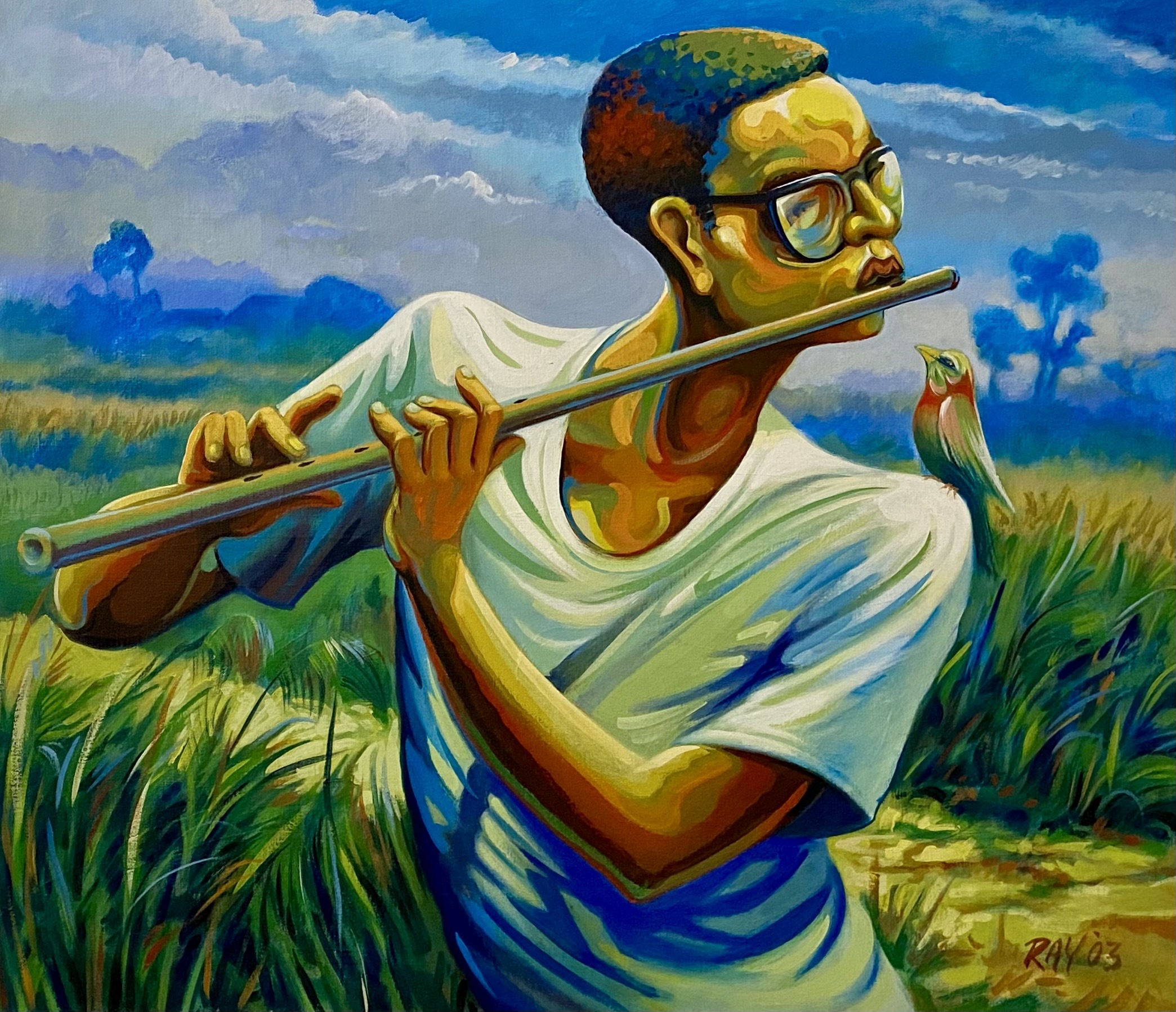 "Dit schilderij geeft mij in fantasievorm weer in de natuur van Suriname met een vogel op mijn schouder. Ik ben gek op de natuur, en mijn fluitspel heeft niet zelden vrije benaderingen van vogelgeluiden".