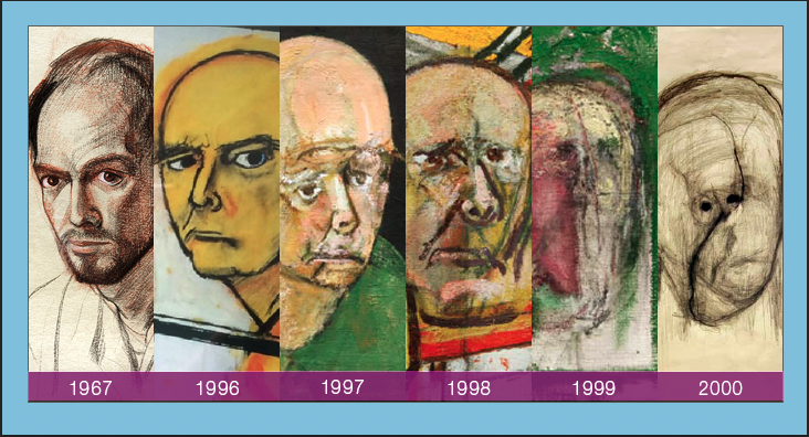 De Amerikaanse schilder William Utermohlen (1933-2007) woonde in Londen toen hij in 1994 merkte dat zijn geheugen en motoriek minder werden. Hij lijdt aan alzheimer, waar hij ook aan overlijdt. De ontdekking van de ziekte is voor de kunstenaar reden om veel zelfportretten te gaan maken, om zo zichzelf en de ziekte beter te leren begrijpen. De werken worden minder gedetailleerd, donkerder, uiteindelijk waziger en zelfs abstracter. In nog geen vier jaar tijd is de tekenstijl totaal veranderd.
