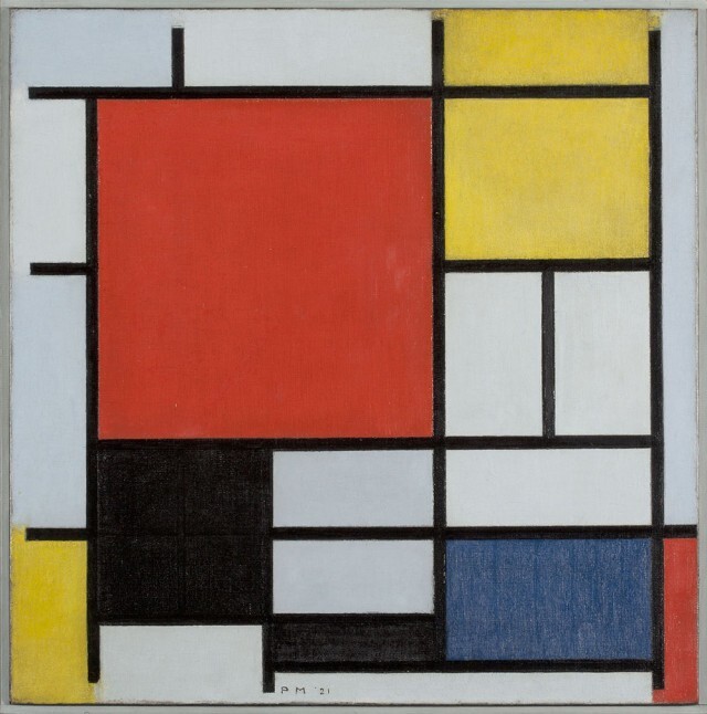Kunstwerk 2: Compositie met groot rood vlak, geel, zwart, grijs en blauw - Mondriaan