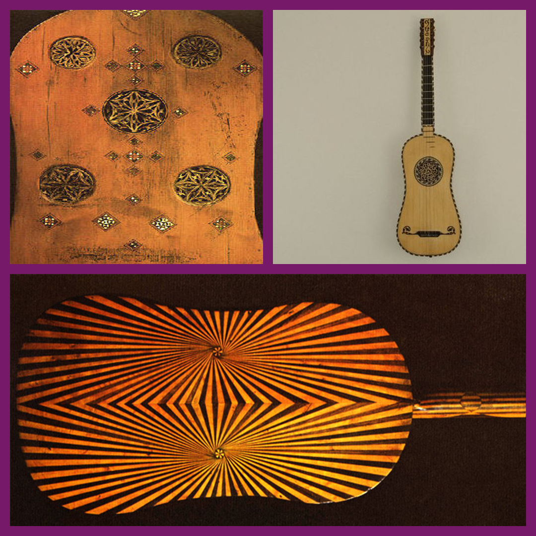 Foto rechtsboven: ‘De boeken van de kleine gitaar’; Foto onder: Vihuela, 1; Foto linksboven: Vihuela, 2
