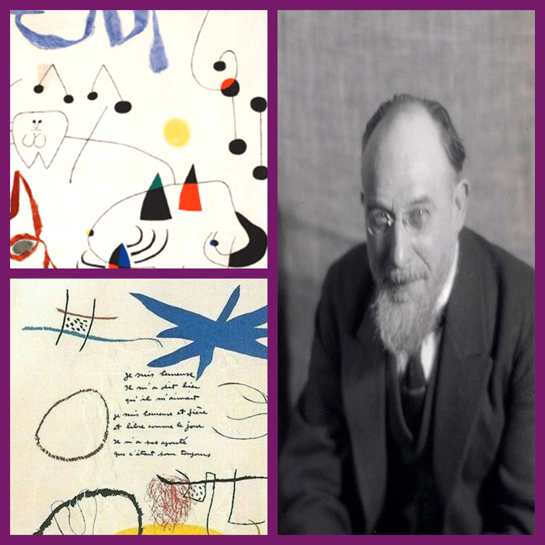 Foto linksonder: ‘Meneer Satie strooit mijmeringen’; Foto linksboven: Miro, tekening (detail); Foto rechts: Satie