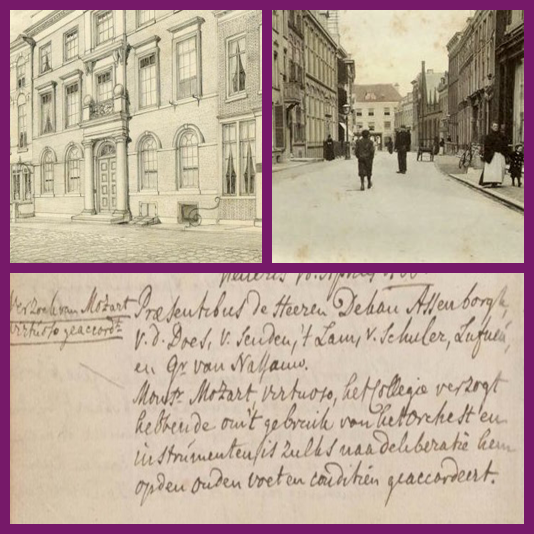 Foto rechtsboven: ‘Mozart in Utrecht, 1766’; Foto linksboven: plaats waar Mozart logeerde (Minrebroederstraat, Utrecht); Foto onder: Aanvraag Leopold Mozart om te musiceren in Utrecht