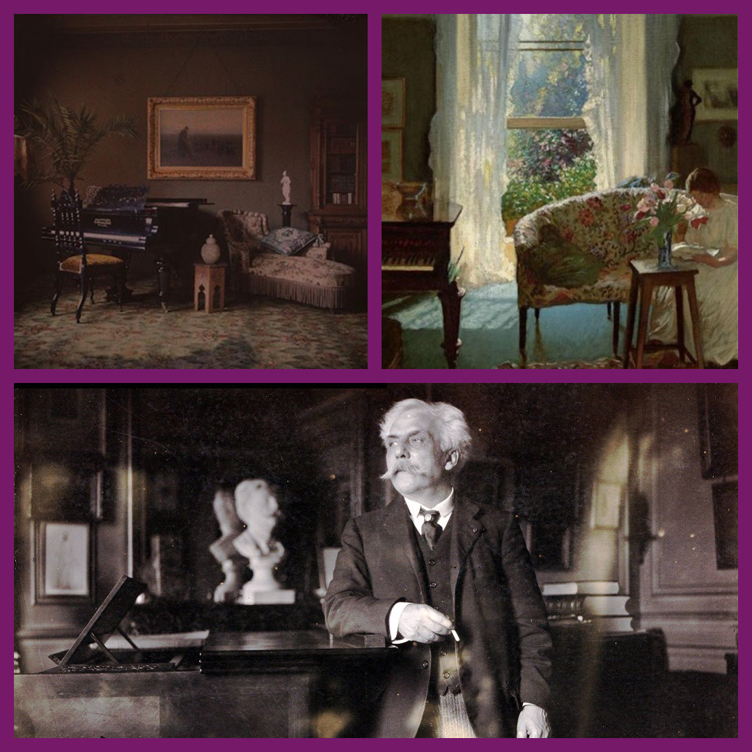 Foto onder: Berceuse voor Gabriel; Foto linksboven: Autochrome, ca. 1910; Foto rechtsboven: George Clausen, schilderij ‘Interieur’