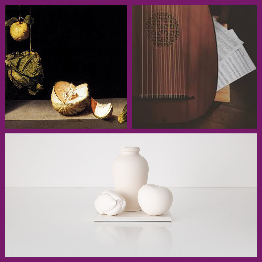 Foto onder: Een kleine stilte; Foto linksboven: Fra Juan Sanchez Cotan ‘Stilleven’ (ca 1600); Foto rechtsboven: Luit