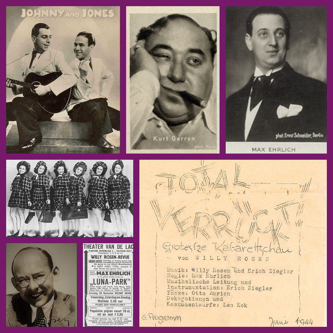 Foto linksmidden: Westerbork Revue; Foto linksboven: Johnny & Jones; Foto middenboven: Kurt Gerron; Foto rechtsboven: Max Ehrlig; Foto linksonder: Willy Rosen; Foto linksonder: Theater van de Lach; Foto rechtsonder: Programma Westerbork Revue
