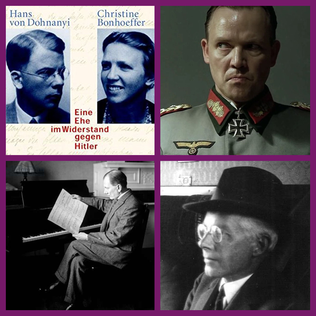 Foto linksonder: Rapsodie voor een kosmopoliet, Von Dohnanyi; Foto rechtsonder: foto Dohnanyi (l) met Bartok (r); Foto linksboven: Hans von Dohnanyi en Christine (zus van) Bonhoeffer; Foto rechtsboven: Achterkleinzoon Julius von Dohnanyi in de film ‘Untergang’