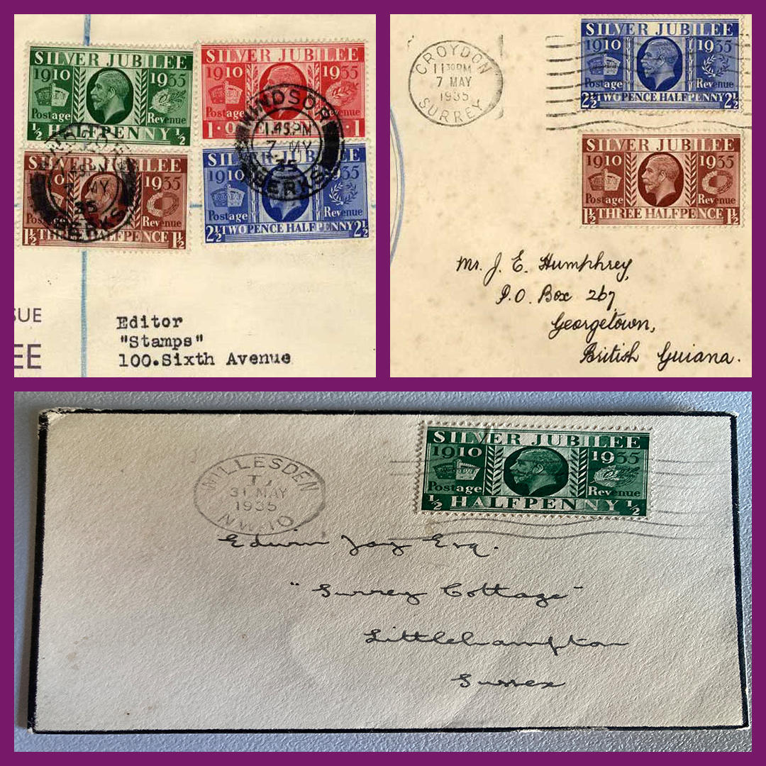 Foto rechtsboven: ‘Muziek voor een postzegel'; Foto onder: De Silver Jubilee postzegel uit mijn Wonderkamer; Foto linksboven: ‘de Silver Jubilee postzegel