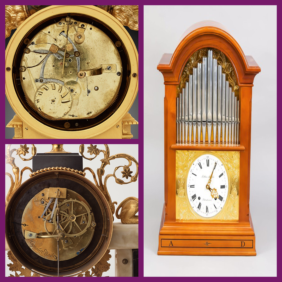 Foto linksonder: ‘Haydn en de Klinkende Klok’; Foto linksboven: Klok, 18e eeuw; Foto rechts: Klok, achttiende eeuw, 2