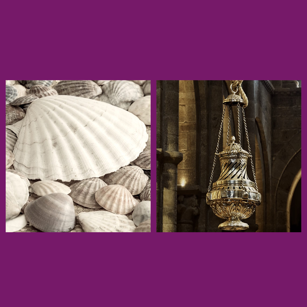Foto links: ‘Camino, of de weg van de pelgrim’, Foto rechts: Wierookvat, Santiago de Compostella
