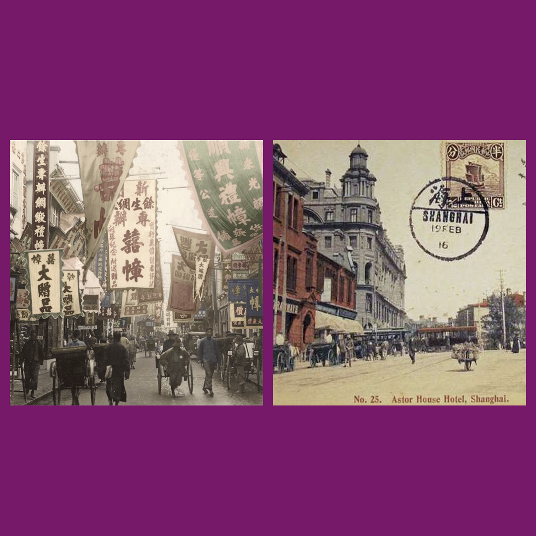 Foto links: ‘Vrijhaven Shanghai’, Foto rechts: Shanghai, oude briefkaart