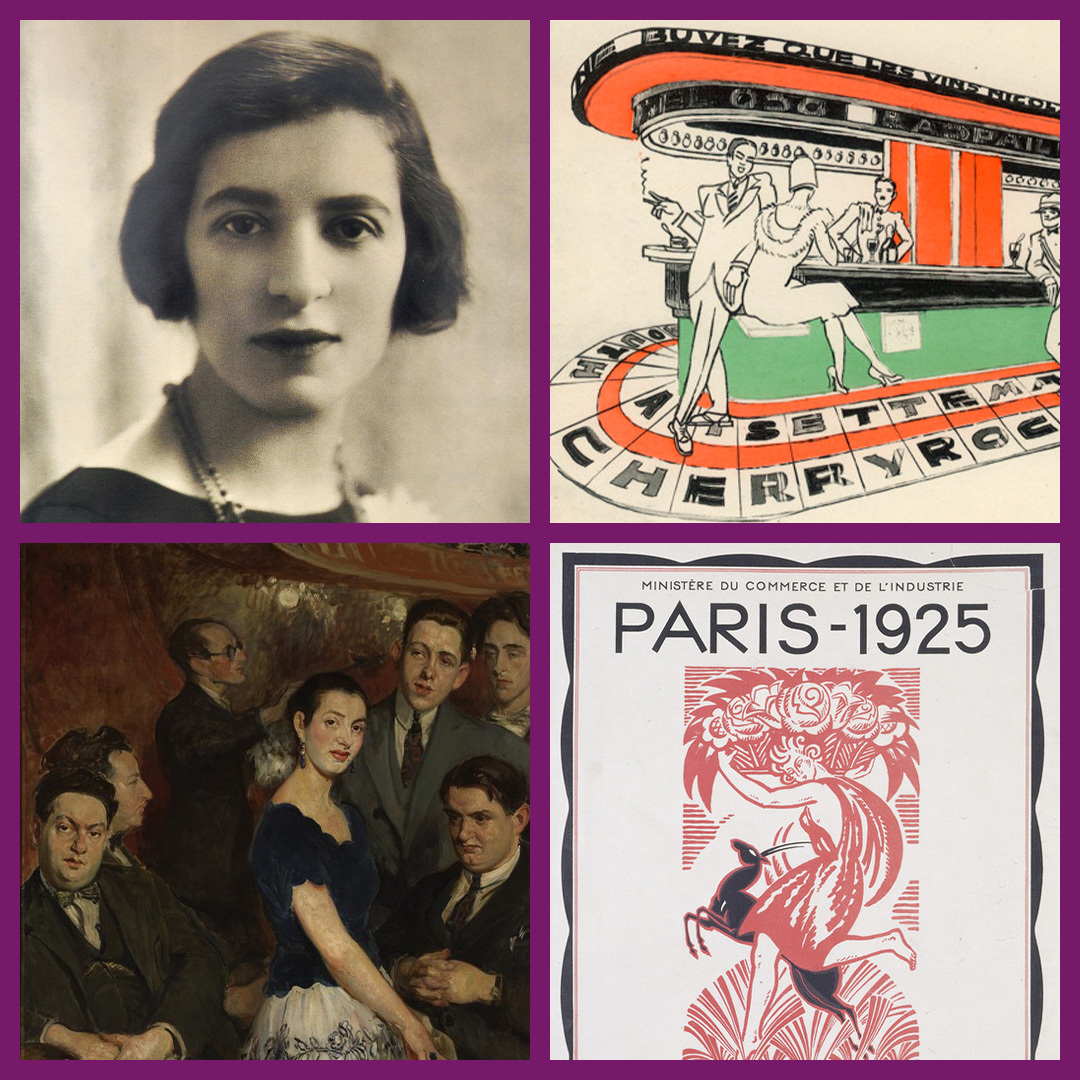 Foto linksboven: de vrouw van het schilderij (Marcelle Meyer), Foto linksonder: Groupe des Six, schilderij, met in het midden Marcelle Meyer, Foto rechtsboven: Poster Art Deco, tentoonstelling, Parijs 1925, Foto rechtsonder: afbeelding afkomstig uit Art Deco tentoonstelling, Parijs 1925