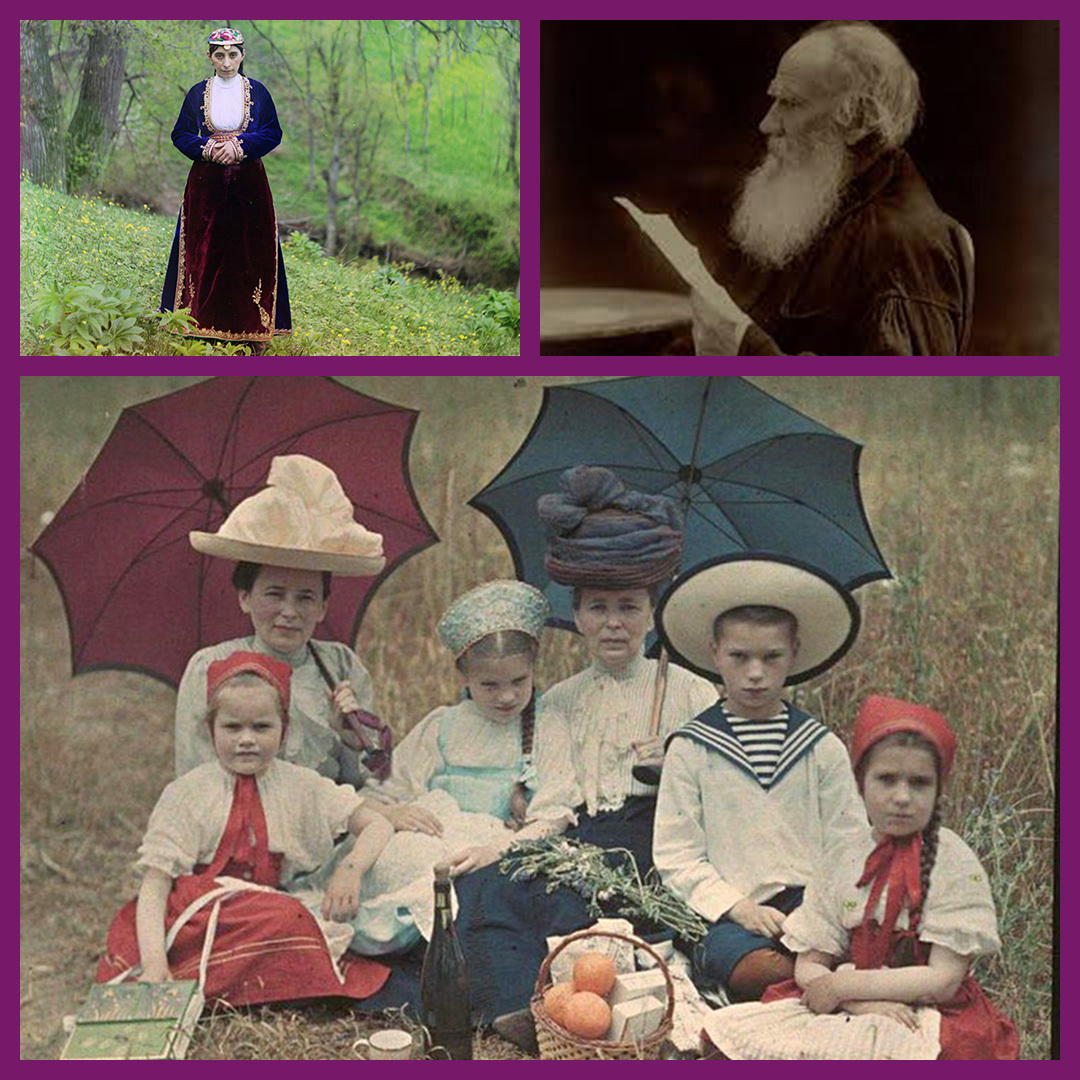 Foto onder: ‘Walsje met Tolstoj’' Foto rechtsboven: Portret Tolstoj' Foto linksboven: Autochrome, Rusland, voor 1918