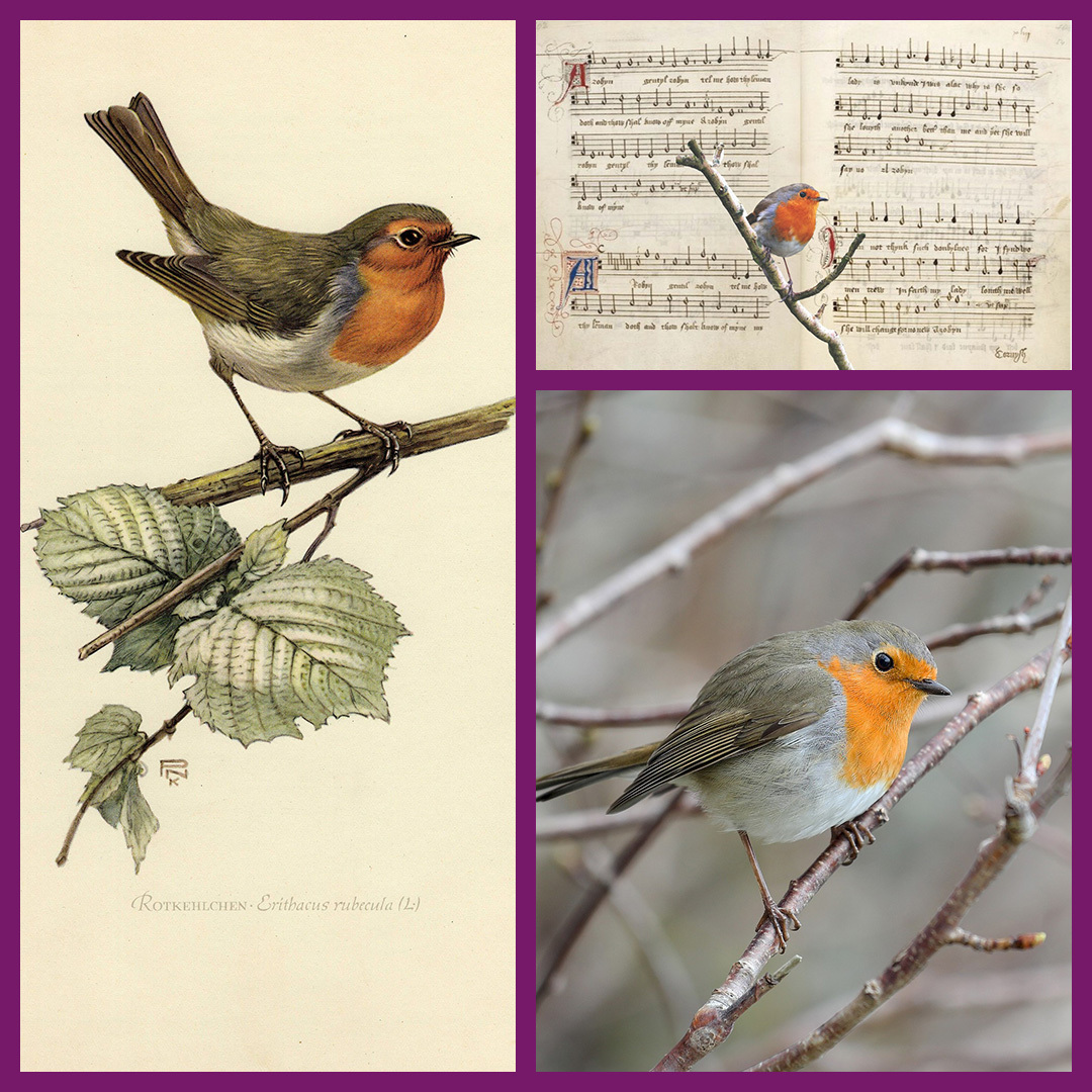 Foto rechtsboven: ‘Roodborstje’; Foto rechtsonder: Roodborstje; Foto links: roodborstje met partituur Cornysh