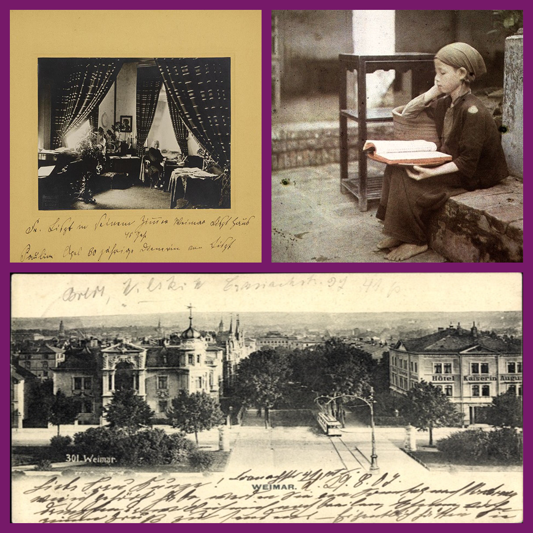 Foto rechtsboven: ‘Wiegende troost’; Foto onder: Weimar; Foto linksboven: Liszt in zijn huis, Weimar