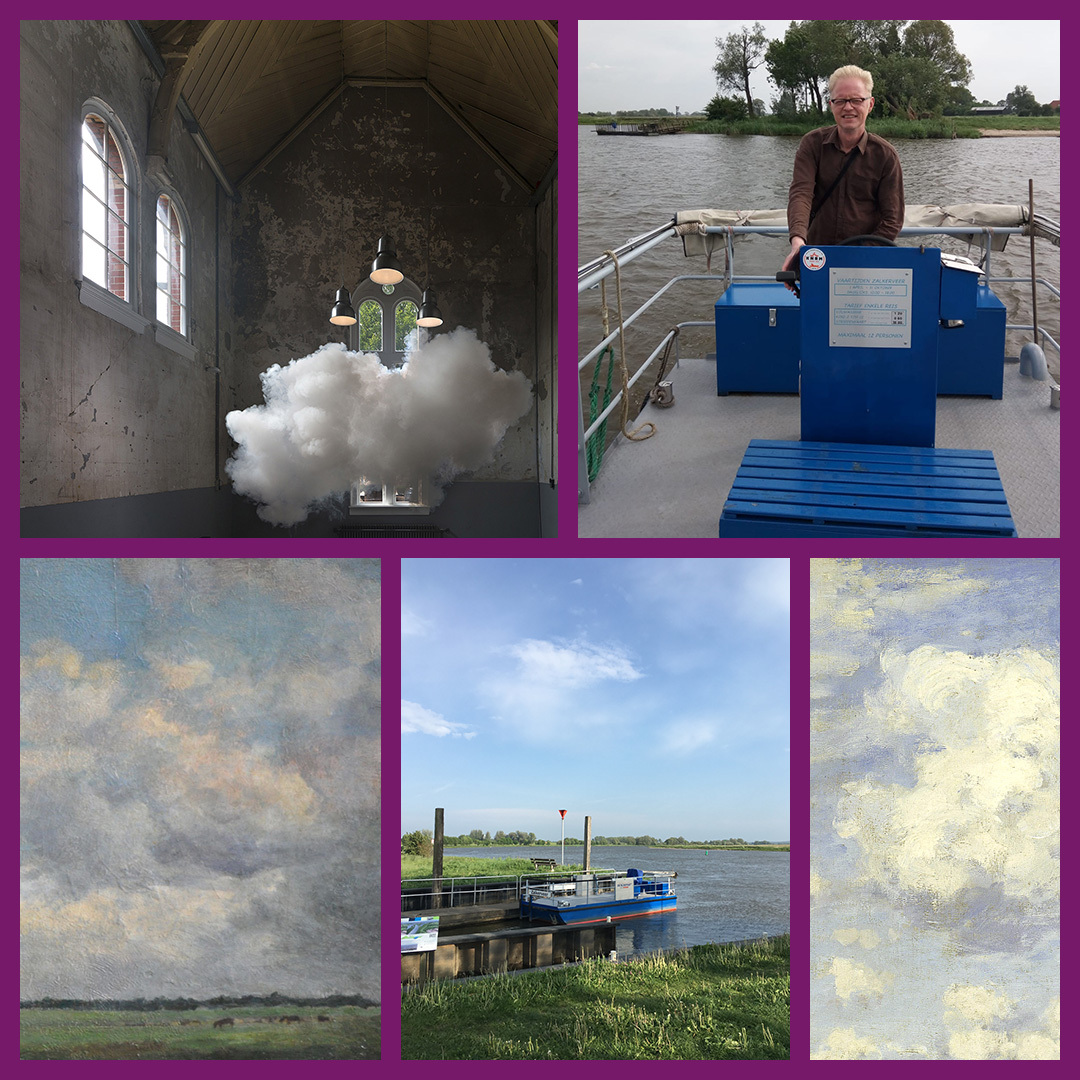 Foto linksboven: Wolken boven het Zalkerveer; Foto linksonder: Wolken, Jan Voerman; Foto rechtsonder: Wolken, Claude Monet; Foto rechtsboven: Podcastmaker als veerman; Foto middenonder: Zalkerveer