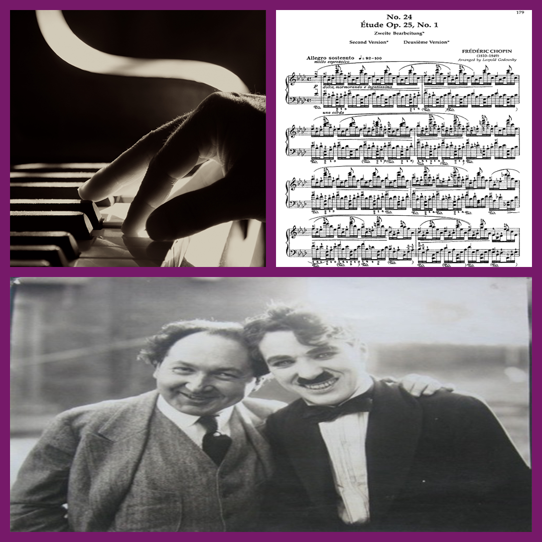 Foto linksboven: ‘Het kan altijd… moeilijker’; Foto rechtsboven: Godowsky, partituur; Foto onder: Godowsky en Charlie Chaplin
