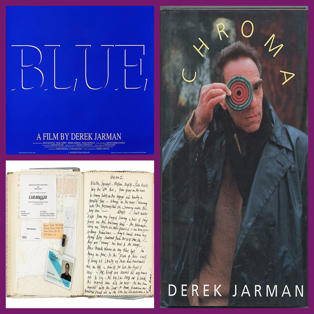 Foto linksboven: ‘Blauw, alles blauw’; Foto rechts: Chroma, een boek over kleur, Derek Jarman; Foto linksonder: uit de schetsboeken van Derek Jarman