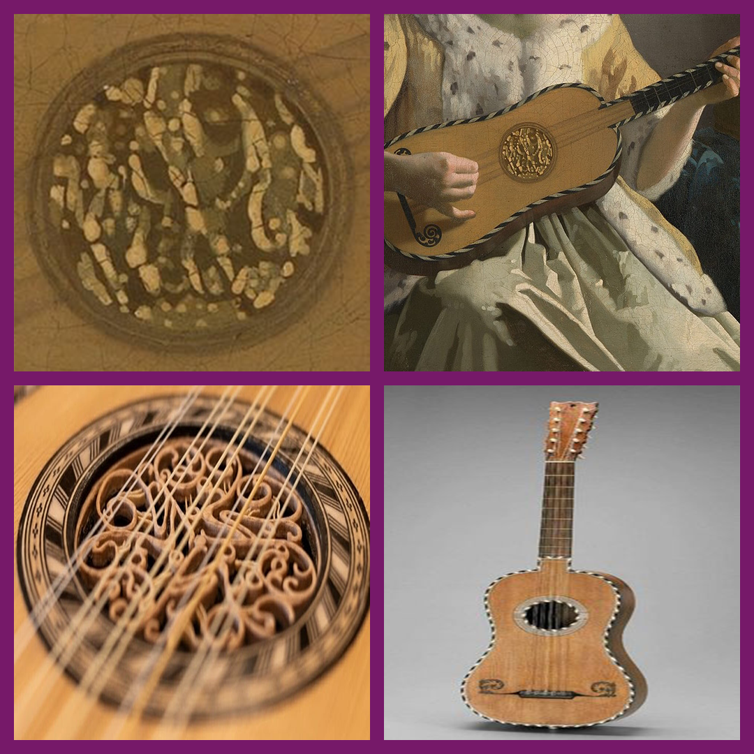 Foto rechtsboven: ‘Johannes Vermeer: de gitaarspeelster’; Foto rechtsonder: barokgitaar; Foto linksonder: barokgitaar, detail; Foto linksboven: barokgitaar, tekening