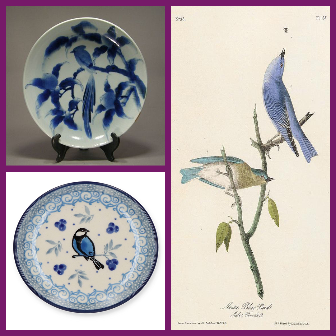 Foto linksonder: ‘Blauwe vogel’; Foto linksboven: Blauwe vogel, Chinees porcelein; Foto rechts: Blauwe vogel, Amerikaanse prent