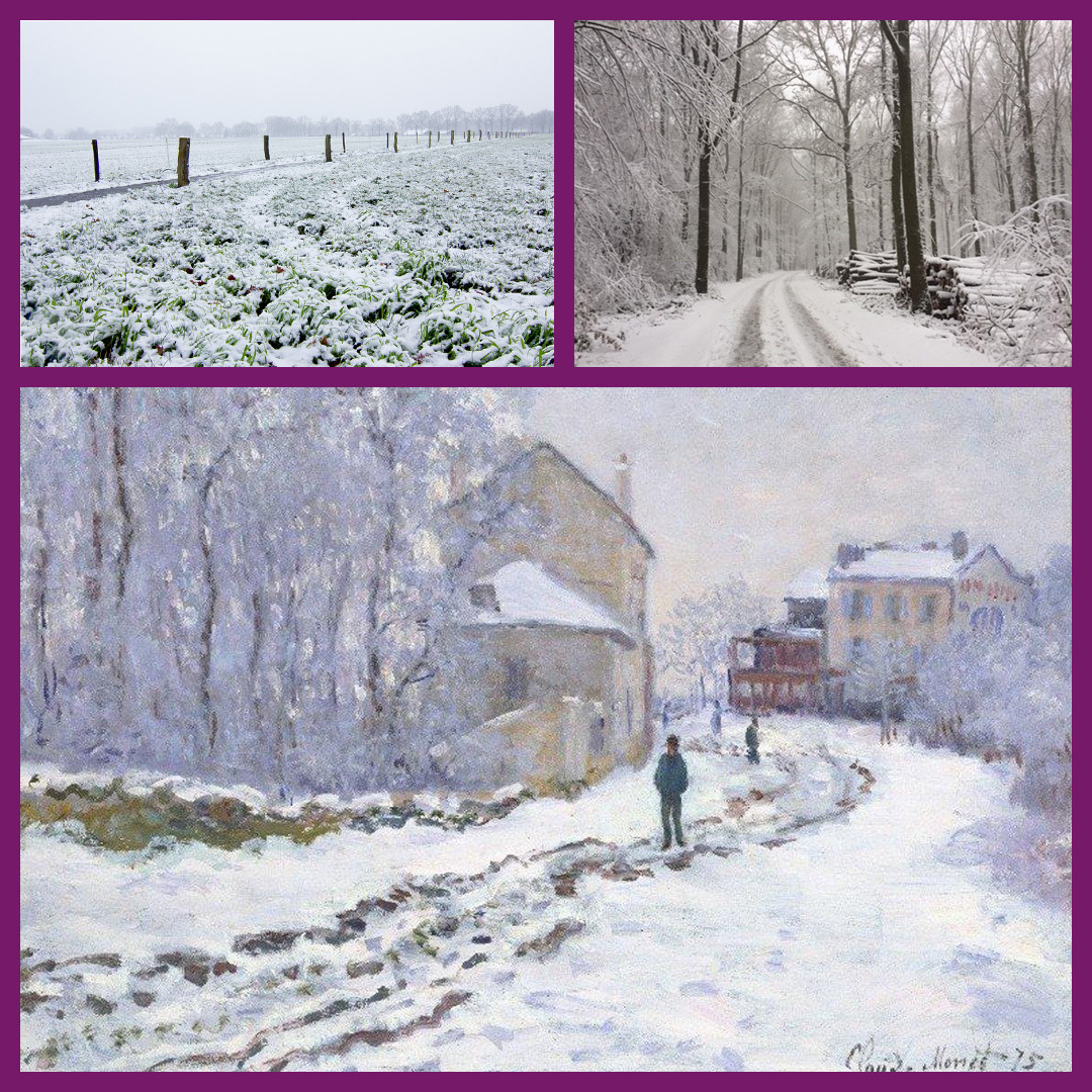 Foto linksboven: Sneeuw / Neige; Foto rechtsboven: Sneeuw; Foto onder: Sneeuw Claude Monet