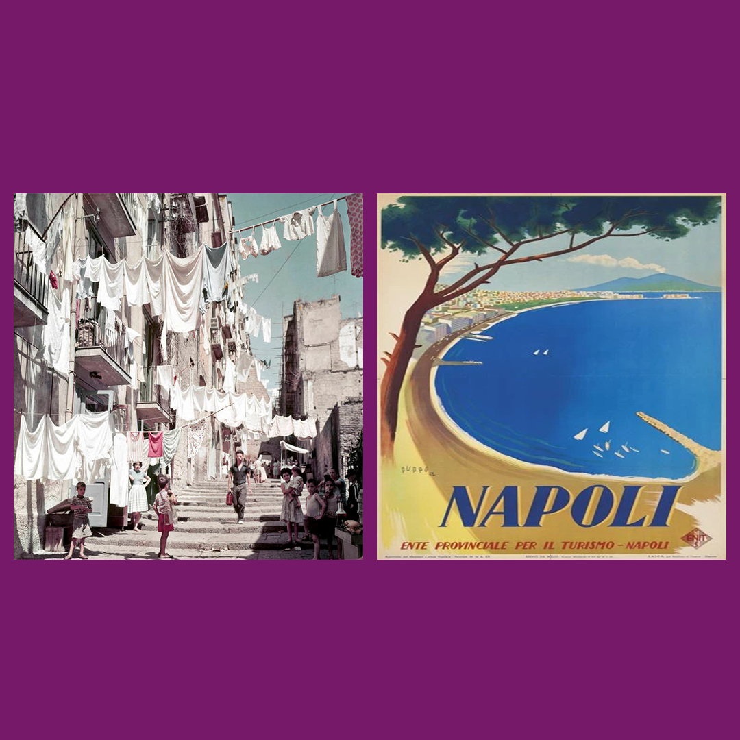 Foto links: ‘Napels; de zon ziende in de mond’, Foto rechts: Napels, uit een reclame-poster