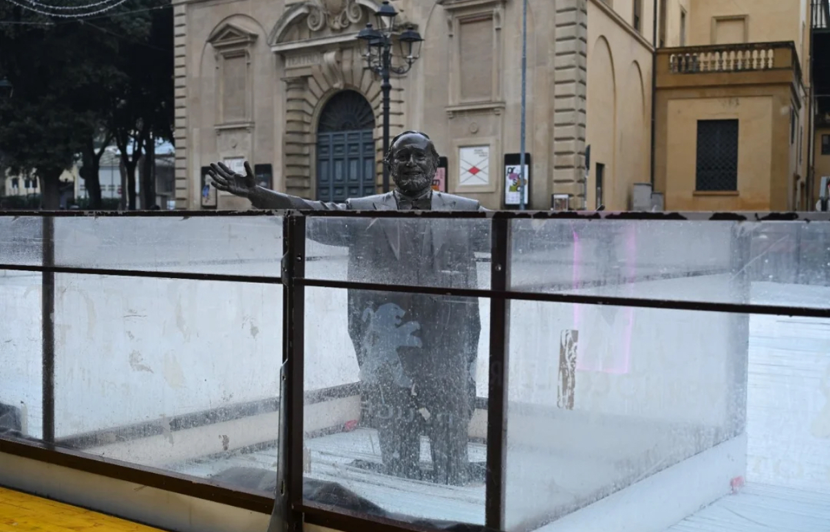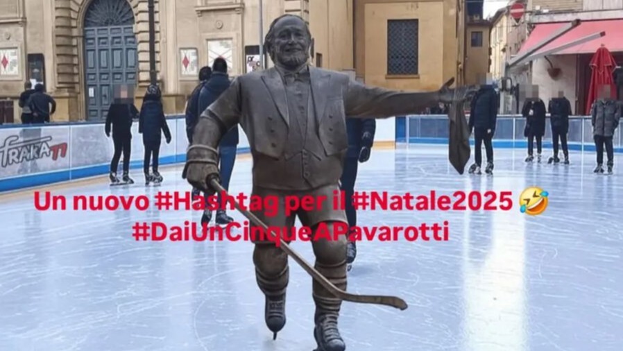 In de stad Pesaro in Midden-Italië is het mogelijk om naast Luciano Pavarotti te schaatsen. Daar is om het bronzen standbeeld van de tenor – die in 2007 overleed – een openluchtschaatsbaan gebouwd. Op foto’s op Instagram lijkt hij tot zijn enkels in een wak te staan.