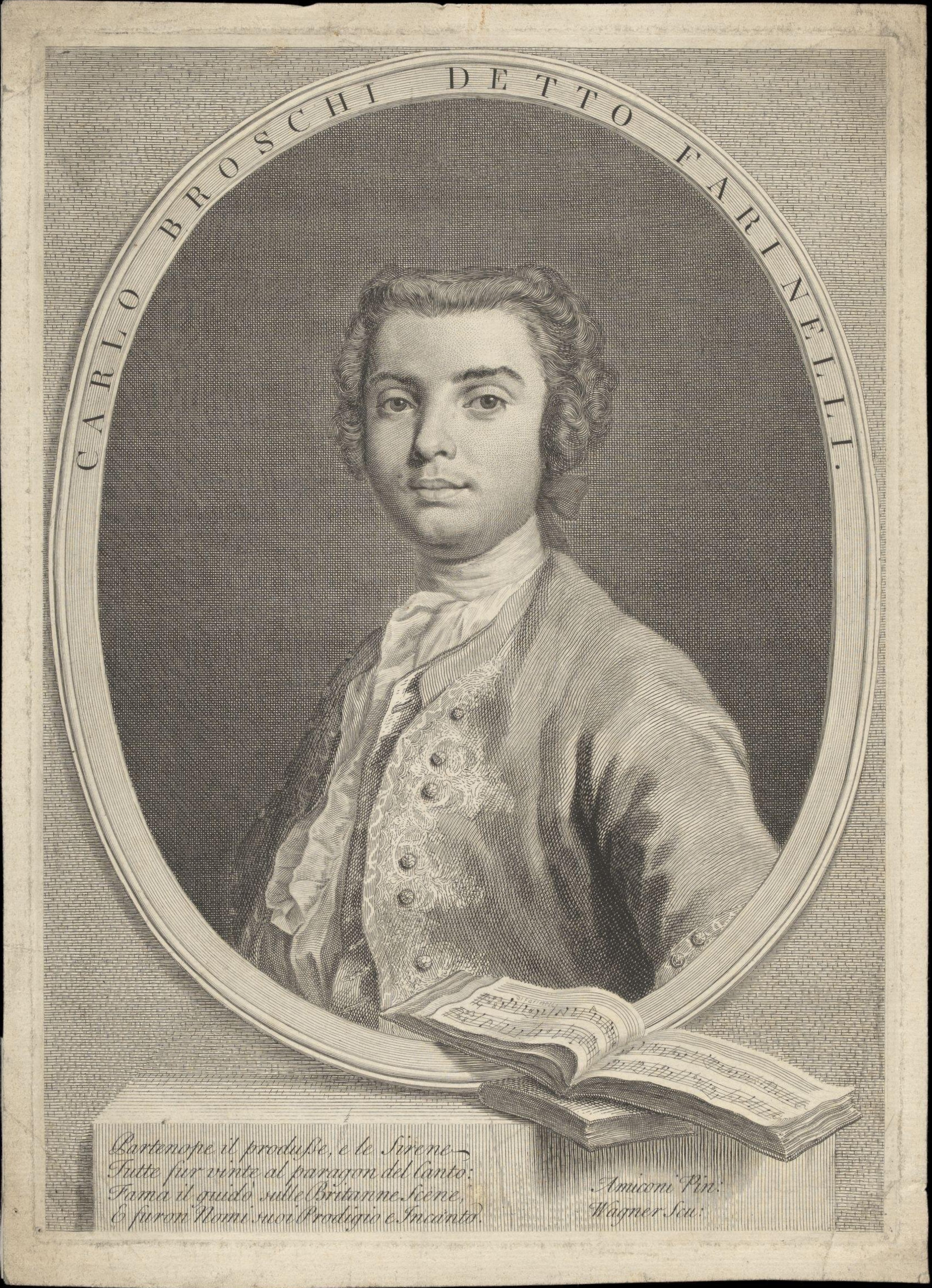 Een tekening van Farinelli op het hoogtepunt van zijn carrière in 1735, hij is hier dus al 30 jaar oud.