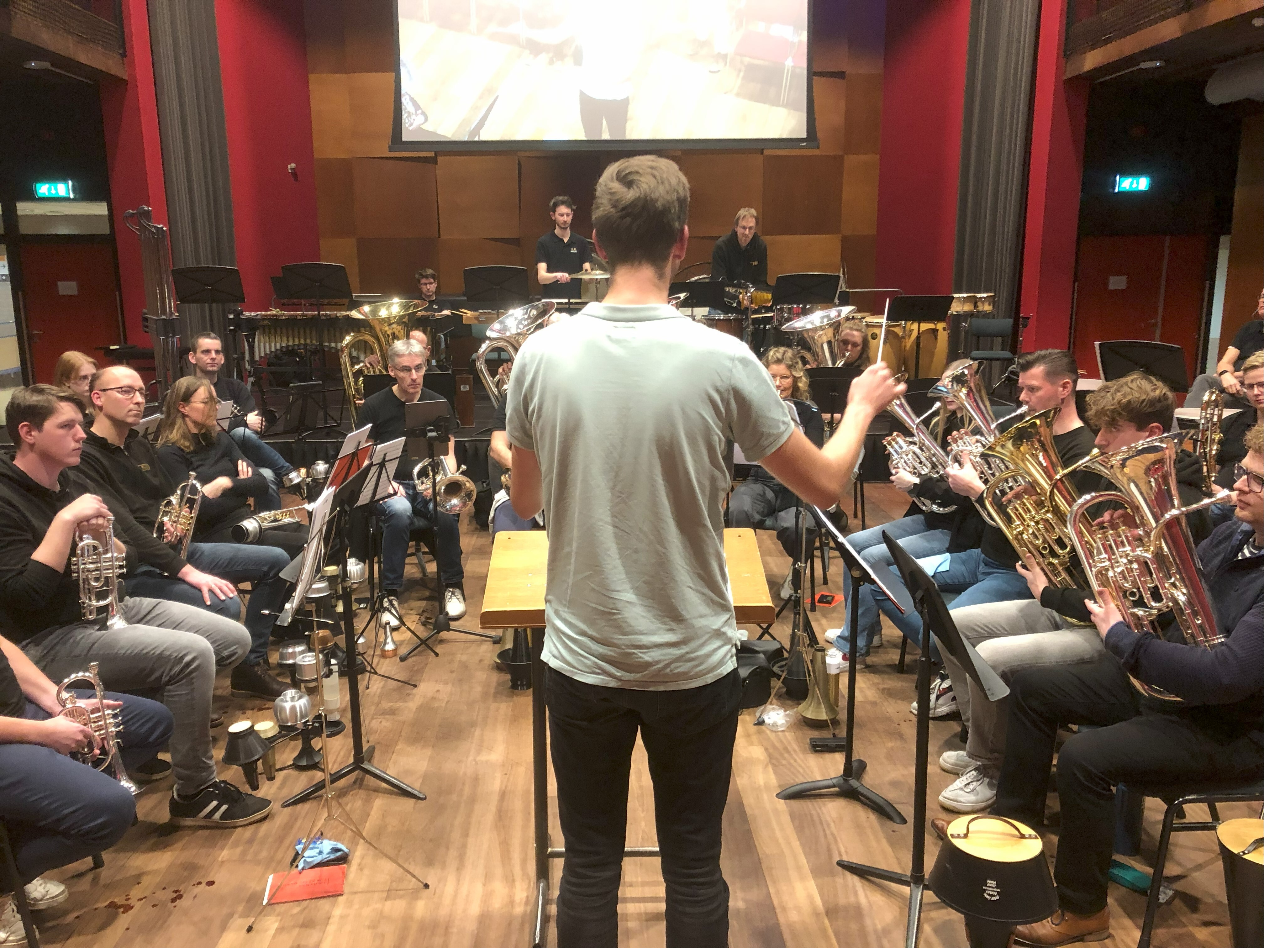In de zaal zitten musici van Soli Brass uit Leeuwarden. Zij spelen in de kampioensdivisie van Nederland. De Vlaming Kevin Houben leidt de sessie en geeft tips aan de dirigerende studenten.