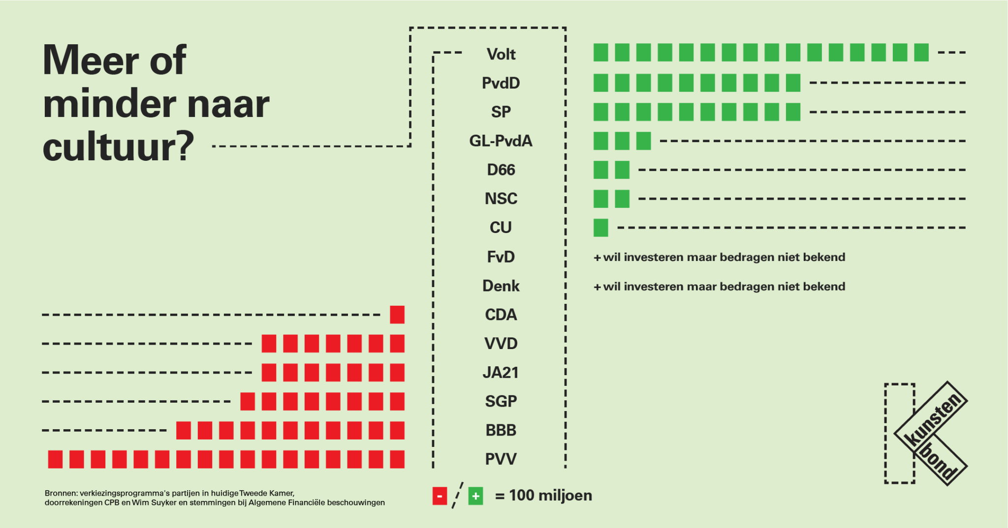 Een infographic gemaakt door de Kunstenbond geeft overzicht: Volt wil het meeste geld investeren in cultuur, te weten 1,3 miljard euro. Dat wil de partij onder andere halen door de belastingvoordelen op bijvoorbeeld sierteelt en de landbouwvrijstelling af te schaffen. "We kunnen beter investeren in datgene wat het leven mooier maakt", zei Volt-lijsttrekker Laurens Dassen in Podium.