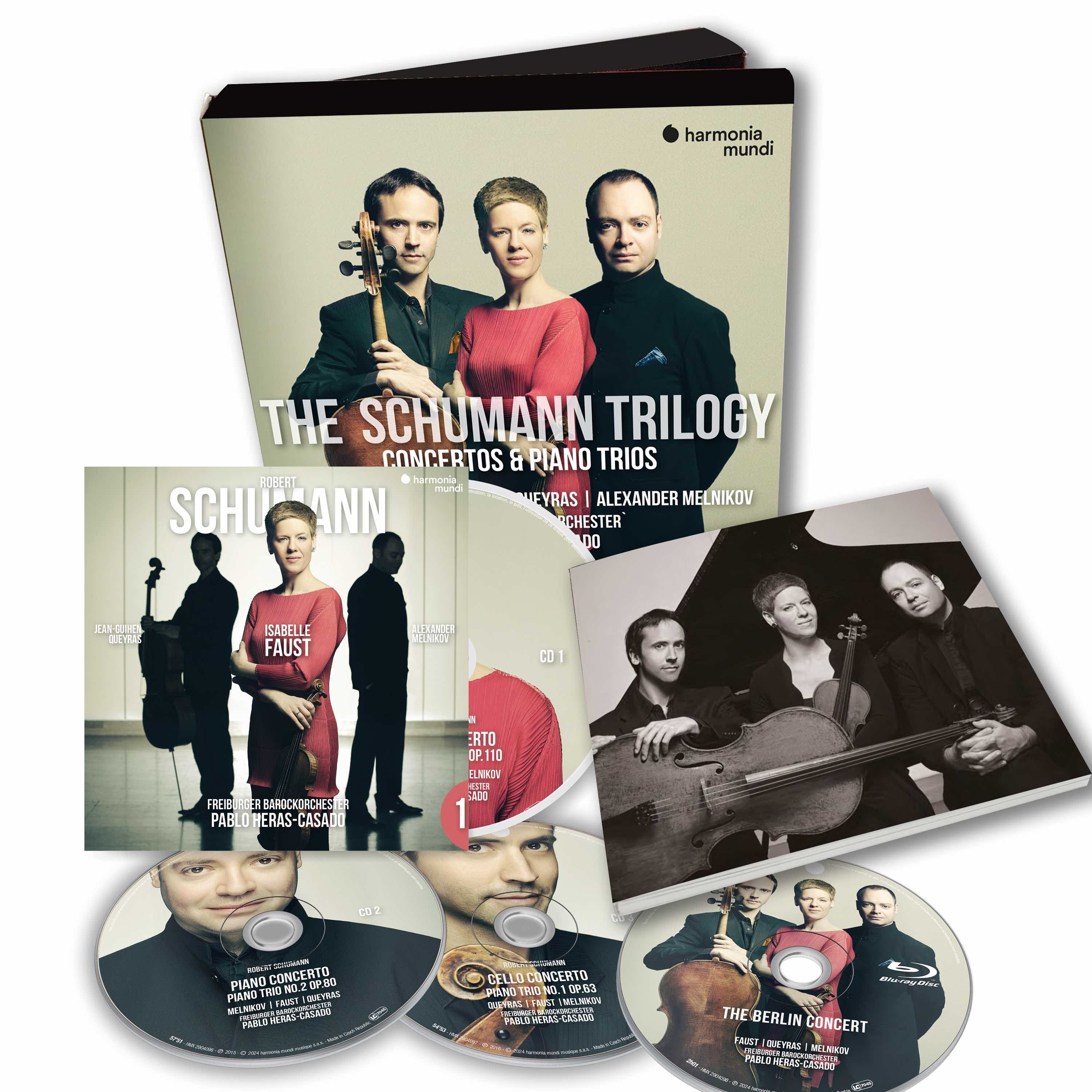Deze gigantische cd-box bevat alle concerten van Robert Schumann: zijn Vioolconcert, Pianoconcert en Celloconcert plús de drie Pianotrio's. Deze Pianotrio's voert violist Isabelle Faust uit samen met cellist Jean-Guihen Queyras en pianist Alexander Melnikov.