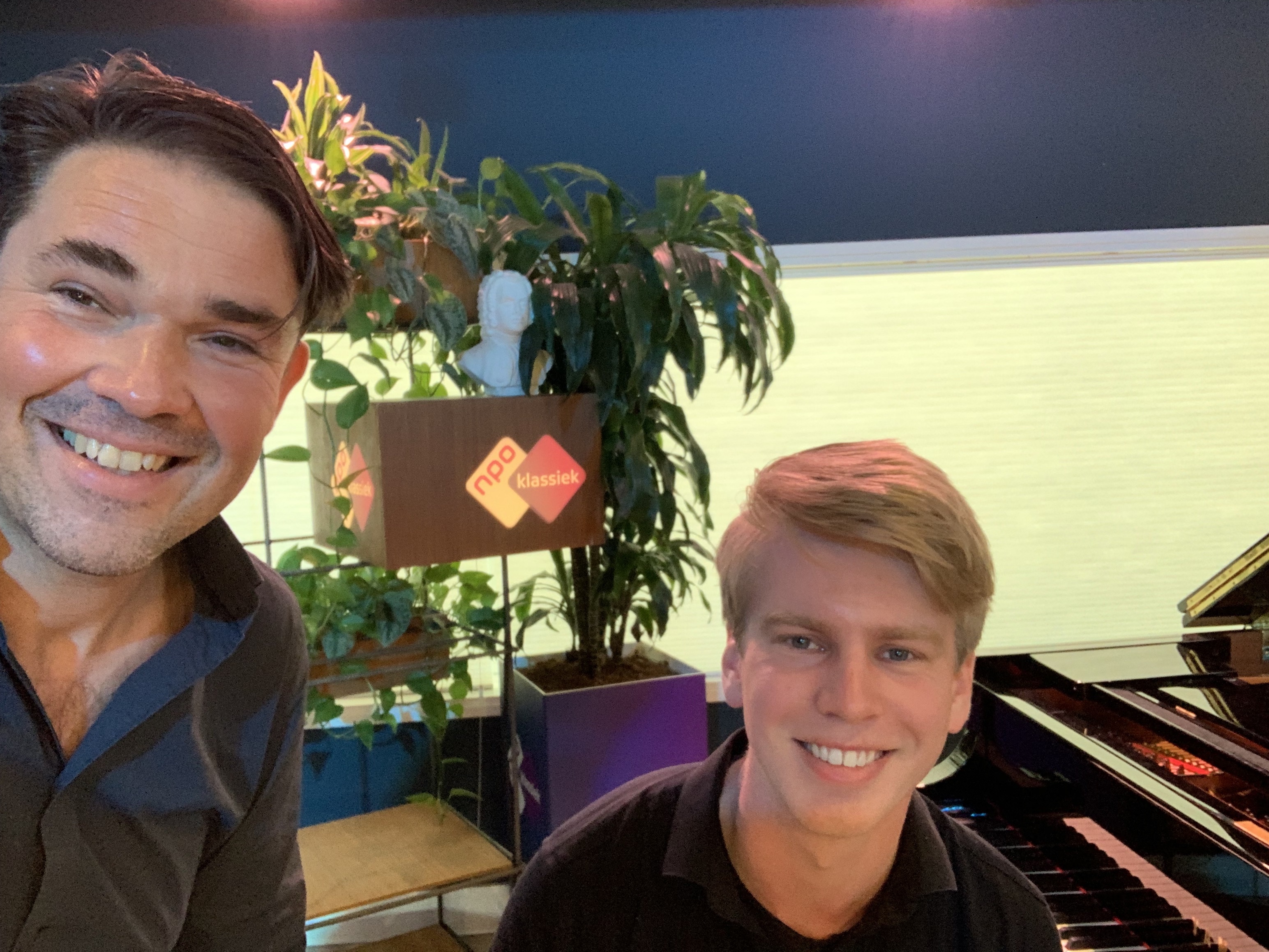 Ab Nieuwdorp (links) en Ramon van Engelenhoven (rechts) na afloop van het recital in de studio in Hilversum: