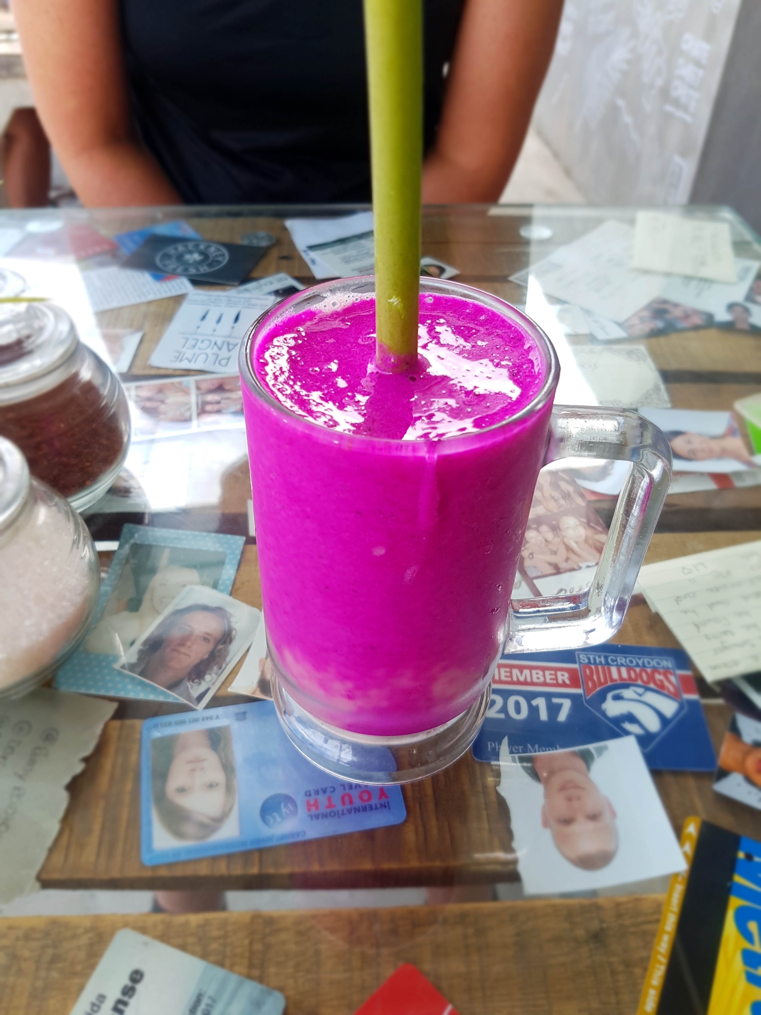Het hoofdingrediënt is drakenfruit, ook wel te vinden onder de naam dragonfruit of pitaja. Niet iets wat je in je buurtsuper vindt, maar je kán het tegenkomen bij grote supermarkten, de betere groenteboer óf een toko. Ik zou zeggen: Als je het een keer ziet, neem het mee en gebruik het. Er zijn grofweg twee varianten: één met wit en één met knalroze vruchtvlees. Beide lekker, maar de knalroze heeft het mooiste kleureffect natuurlijk! De smaakt lijkt een beetje op die van kiwi, maar dan net wat minder zuur.