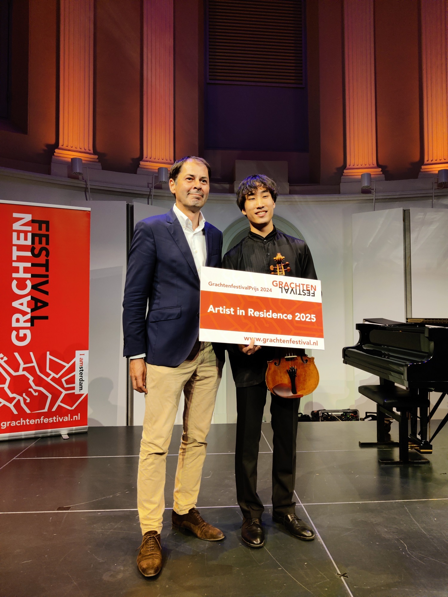 Winnaar Takehiro Konoe met directeur van het Grachtenfestival Tonko Grever