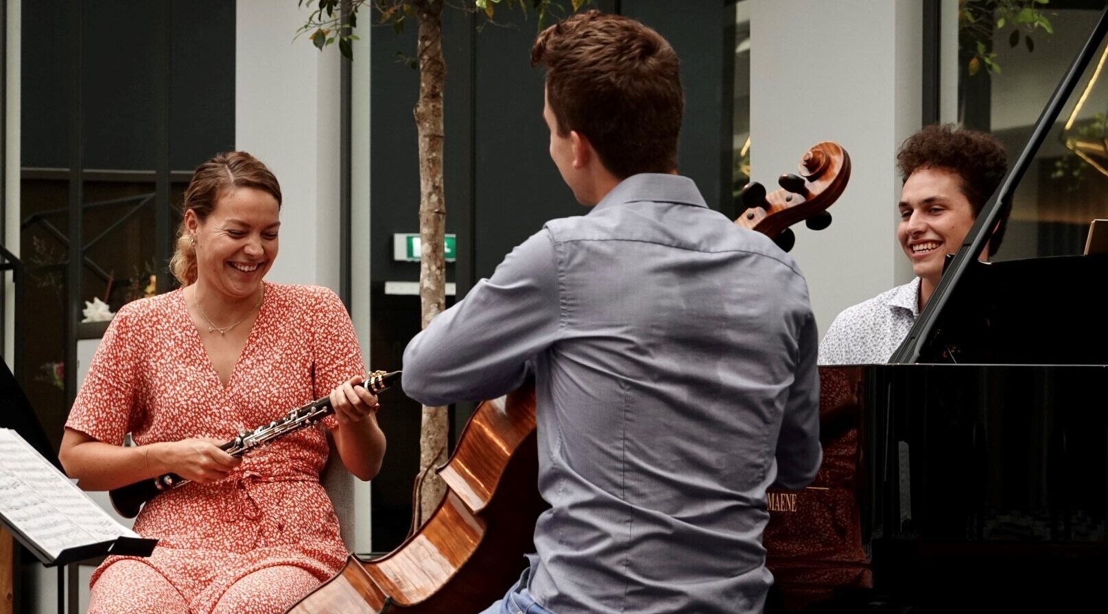 Gerbrich Meijer, Anton Spronk en Nikola Meeuwsen hadden veel plezier tijdens hun repetitie voorafgaand aan de Avond van de GrachtenfestivalPrijs.